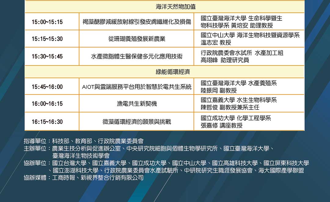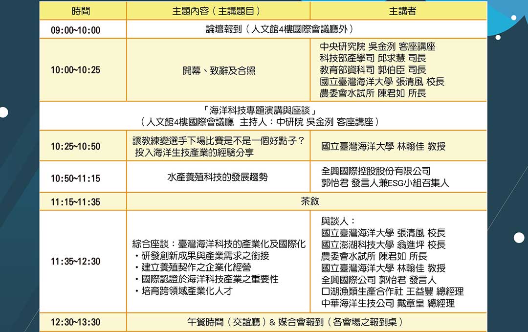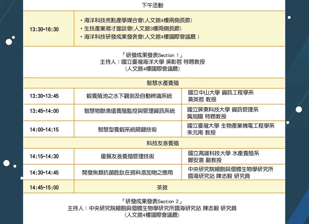 上午有兩位keynote speaker及專題座談,座談主題:臺灣海洋生技的產業化及國際化。下午分為水產養殖及食品與漁業科技兩項section發表研發成果,由國立臺灣大學、國立臺灣海洋大學、國立成功大學、國立中山大學、國立高雄科技大學、國立屏東科技大學、國立嘉義大學、國立澎湖科技大學及水產試驗所中,由各單位推派1-2位代表出席演講。
