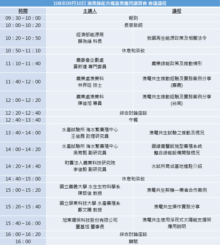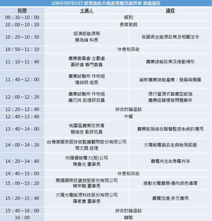 配合國家農業綠能政策推動,並促進農能共構產業推動與實施,透過相關課程說明,提高業者、農漁民與大眾對農(漁)業綠能共構體系之認知,瞭解實務上農電結合型態與農漁業作業調整,以「農業為本、綠能加值」為主軸,在不影響農漁業生產與權益下,透過綠能設施的導入,改善生產環境,創造產業轉型加值的契機。課程中,透過農業綠能政策、法規、試驗成果與實際案例操作等構面,讓與會者對農業綠能共構推動與發展有更進一步的認識,並瞭解後續辦理培訓課程之需求,提供與主辦單位最為培訓課程之參考,促進未來整體產業推展更形順暢。