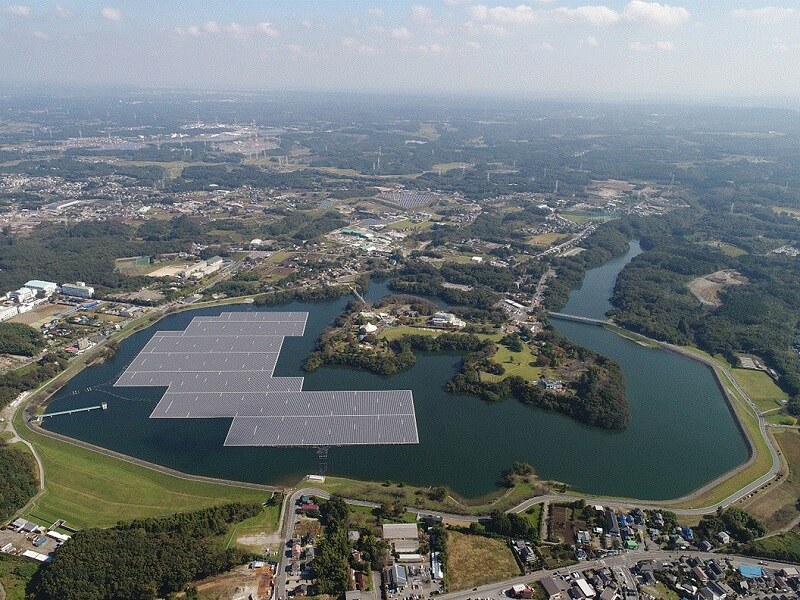 千葉・山倉水上太陽能發電所,自2015年年底動工,於2018年完工,鋪設面積達18萬平方公尺,鋪設5萬多枚太陽能板,裝置容量達13.7MW,年發電量1,617萬度,約能供應4970戶家庭用電。