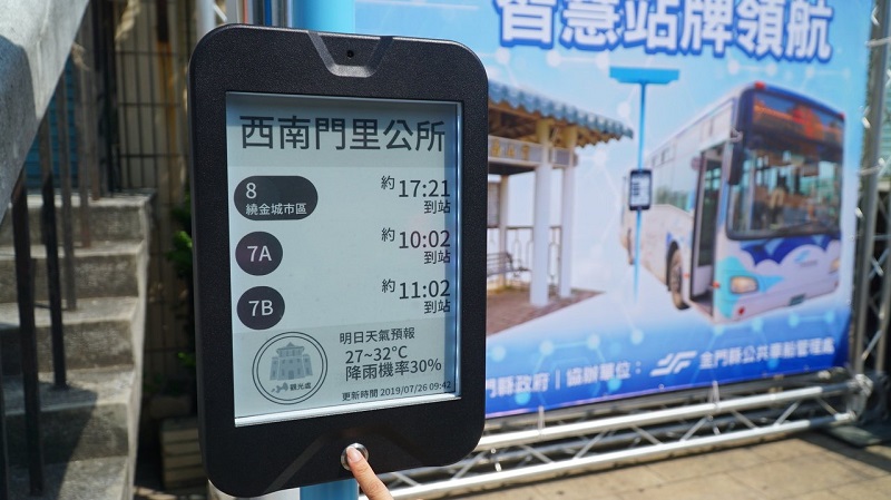 縣府今天在西南門里公所前公車站牌舉行「智慧站牌揭牌」典禮,由秘書長陳朝金、金城鎮長李誠智、縣府觀光處副處長李銘培等人共同主持。目前金門縣已安裝完成啟用3座試驗性質電子太陽能智慧公車站牌,裝設於西南門里公所站及水頭碼頭站,採用13.3吋省電黑白電子紙,搭配太陽能板及太陽能電池獨立運作。