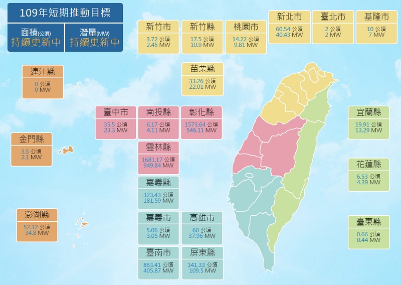 能源局公開資訊,彙整各部會目前閒置、可作光電利用的公有土地及電網資訊公開在「太陽光電單一服務窗口」網站上。目前以雲林縣、彰化縣為大宗,裝置潛量達950MW、546MW,資料會定期滾動更新。